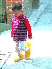 作品描述:这个贪玩的小男孩穿着双大鞋,看着就怪累的。
