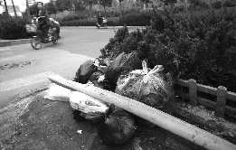 17日,在潍坊市北海路东风街路口北道路西侧的绿化带中,十几袋的垃圾就堆在绿化带边,垃圾散发出一阵恶臭,流出的臭水也积存在路边,与绿化带格格不入。
