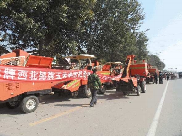 本报聊城10月17日讯(记者 任洪忠)17日上午,25辆玉米联合收割机堵在市区山东农机产品大市场门外(如上图),还有两辆堵在农机市场中聊城鑫东方农机总经销门前。购机村民反映,他们因买的收割机不能正常工作要求退机。
