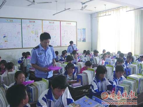 在得知部分群众对学生道路通行安全普遍关注的情况下,立即将有关学生道路通行安全的知识汇总并印制成《学生交通安全责任书》4万余份(一式两份,学生和学生家长留存一份,中队留存一份),向广大学生和学生家长发放,让他们共同学习并签字认可,形成维护道路交通安全人人有责的氛围。图为巨峰中队民警将《学生交通安全责任书》送到每名学生手中。