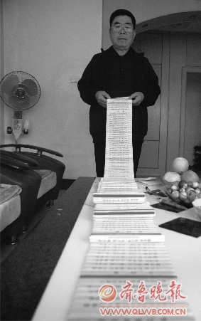 记者在最长的那卷“仿竹简长卷”上看到一篇篇抄得整整齐齐的《百家姓》、《三字经》和《弟子规》。吕振江告诉记者,这些都是中国最传统的文化,但是现在大家都不大重视了,“这也算是一种宣传。不管别人怎么看我的这种行为,我一定会把爱好坚持下去。”