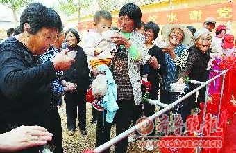 18日一大早,全村的男女老少都暂时放下了手头的农活,涌上了街头,捧着装满了山楂、枣、核桃的竹篮,夹道欢迎为他们送来甘泉的大众报业集团和山东省地矿局的“恩人们”。