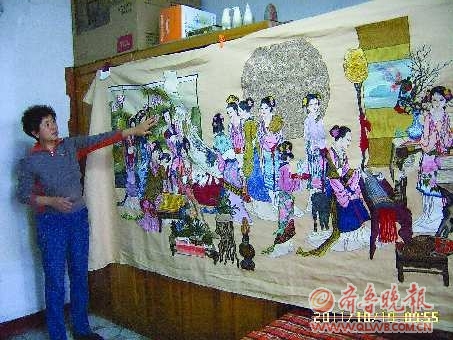 朱桂荣和她的大型十字绣作品﹃红楼梦琴棋书画﹄ 陈伟 摄