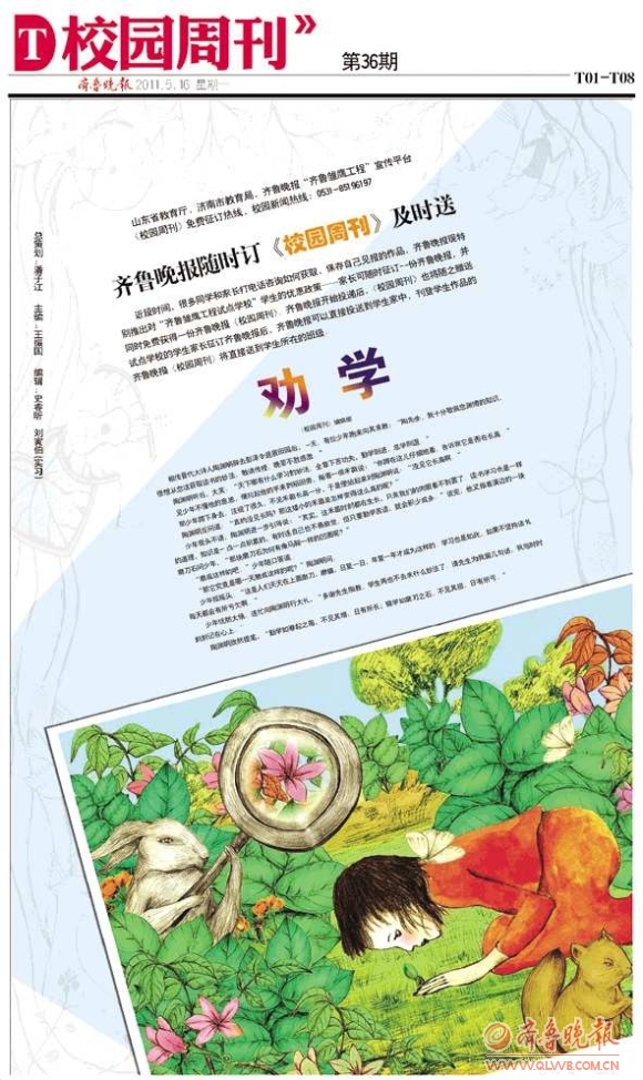 为进一步配合我省素质教育改革的深入推进,丰富广大中小学生的课余生活,全面提高他们的综合素质,山东省教育厅、济南市教育局和齐鲁晚报联合于2010年4月启动“齐鲁雏鹰工程”。作为展示该活动的主要平台,齐鲁晚报《校园周刊》试行一年多来,受到了广大中小学生和老师的欢迎。因目前“齐鲁雏鹰工程”尚在摸索前进阶段,