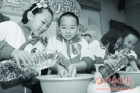 19日上午,在南京路小学,40余名小学生在游戏中学习正确洗手,保障健康。当日,为响应第四届“全球洗手日”主题———“正确洗手,乐享健康”,肯德基开展了食品安全进校园活动,邀请食品卫生专家向同学们讲述如何正确洗手,防止腹泻和肺炎等卫生疾病。