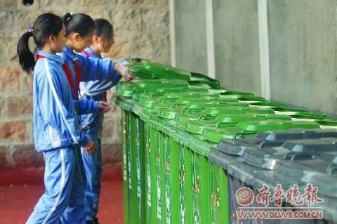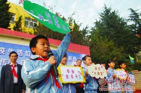 19日,在新昌路小学,同学们手持环保宣传画为如何合理分配生活垃圾出谋划策。当日,由市政公用局团委与市南区团委、市南教育局等部门联合组织的市南区生活垃圾分类收集进校园宣传月正式启动,市政公用局向市南区40所学校赠送了150个垃圾桶。