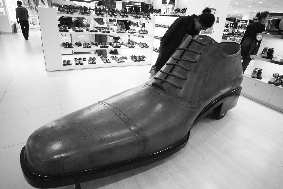 18日,在潍坊中百大厦皮鞋销售区,一只超大码的“皮鞋”吸引了顾客的目光。据销售人员介绍,这只皮鞋长度有2.3米,重量在150公斤左右,在皮鞋的底部还安装有轮子,坐在里面可以驾驶这只皮鞋。