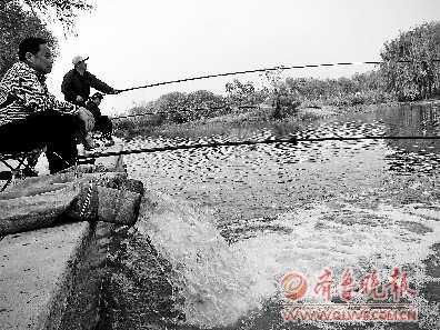 为保持公园湖体景观特色,维护湿地生态系统和喷泉设备安全,10月18日,德州长河公园正利用水泵从岔河补水,此次补水大约持续20余天,约蓄水18万立方米。图为钓鱼爱好者在钓鱼。 本报记者 马志勇 本报通讯员 李姝 摄影报道