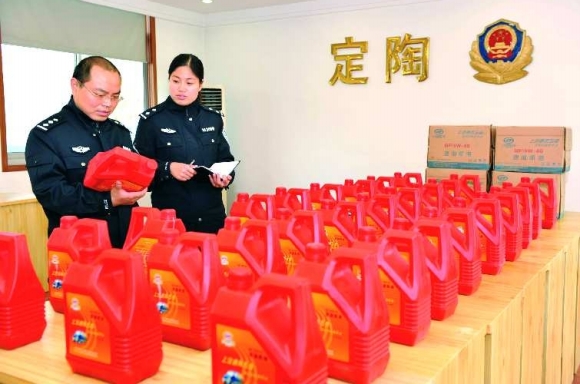 10月19日,定陶县公安局经侦大队民警正在清点收缴的假冒商标润滑油。当日,定陶县公安局经侦大队在定陶城区一修理厂内,将销售假冒商标润滑油的嫌疑人刘某抓获,当场收缴假冒名牌商标机油30余箱,涉案价值近万元。