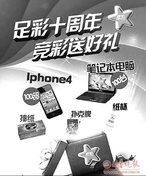 为庆贺竞彩开通单场固定奖、感谢广大彩友长期以来对竞彩游戏的支持和参与,值足球彩票上市十周年之际,山东体彩中心将从10月24日起,开展“足彩十周年 竞彩送好礼”活动,iphone4手机、笔记本电脑、抽纸、纸杯、扑克等好礼倾情回报彩友。