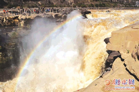 黄河壶口瀑布素有“天下黄河一壶收”之誉,入秋以来水量渐涨,吸引了大量游客前来观瀑。图为10月18日,一道美丽的彩虹横贯壶口瀑布上空,形成壶口瀑布四大奇观之一———“彩桥通天”。