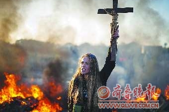 在与警方冲突中,一名妇女拿着十字架进行反抗。当地时间10月19日,在经过10年司法斗争后,50多名防暴警察开始清理位于英格兰南部的英国最大非法流浪者营地戴尔农场,这个营地主要有吉普赛人和爱尔兰人。警方声称遭到很有经验的活动分子和当地居民抵抗,不过他们从营地后门进入,避开了示威者设置的路障,他们还用强力电击枪向抵抗激烈者开了火。