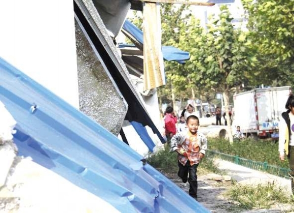 20日下午,在市区柳园南路一所小学附近,上学的孩子在废旧的铁皮房子前奔跑。这段路有20多米都是这种铁皮房子,铁板悬在半空,孩子们在下面走很危险。