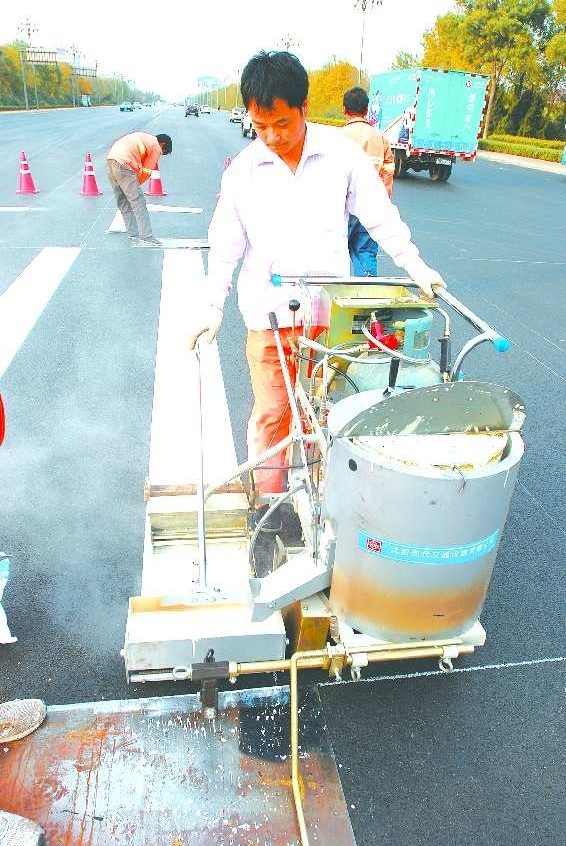 20日下午,在东二路上,工作人员正在为刚翻新的路面划上斑马线,东二路上黄河路至南二路部分路段从10月初开始翻新,现已完工。 本报记者 任小杰 见习记者 耿璐 摄影报道