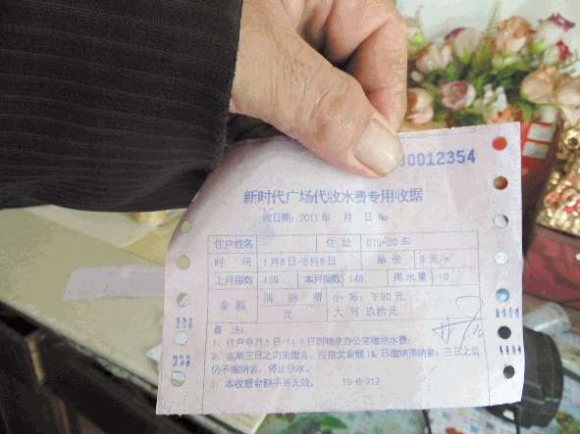 “俺们上下楼不方便,所以在车库住。”23日上午,在新时代小区郑先生的太太告诉记者,物业说商业用水是4.68元每方,加上水损合9块,哪有这么高的水损?在屋内桌子上,放着一些交水费的单据。“你看看,俺这水费咋这么高。”郑先生说,一个月不怎么用水,水费都得近百块。