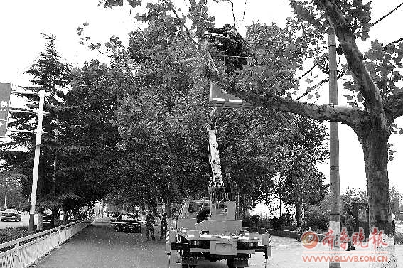 为提高道路行道树观赏效果,促进树木生长,22日上午,牡丹区园林处20余名工作人员利用高空修剪车对中华路法桐行道树进行修剪,重点除去树木上的枯枝、死枝。通过修剪,不仅保证了树木健壮枝的养料供应,也使树木看上去更加浓绿苍翠,赏心悦目。图为牡丹区园林处工作人员正在中华路修剪法桐行道树。