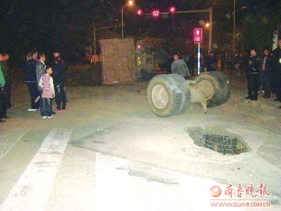 21日晚上8时许,在北辛路和塔寺路交界处,一辆拉沙土的大货车把路面上的井盖轧塌,货车侧翻,所幸司机并无大碍。24日,工人已经把损毁的井盖修好。图为事发时的情景。