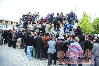 2011年10月24日,土耳其埃尔季什镇,人们在哄抢一辆红新月会的卡车。土耳其东部23日发生7.2级地震。土耳其东部与伊朗接壤的凡省凡市以及埃尔季什镇受灾最为严重。另据土耳其总理府25日说,土耳其东部凡省23日发生强烈地震造成的死亡人数已上升至432人。