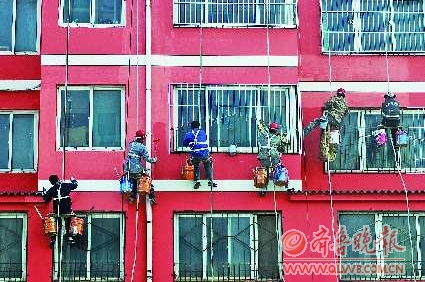 10月25日,德州青年路,几名粉刷墙壁的施工人员悬吊在绳索上熟练地进行着粉刷工作,一个个忙碌的身影,恰如一个个跳动的音符。