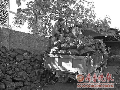 24日,一煤球厂内堆满了煤炭,又有一车煤炭运了进来。煤炭销售已经进入旺季,煤球厂购进煤炭准备生产煤球。