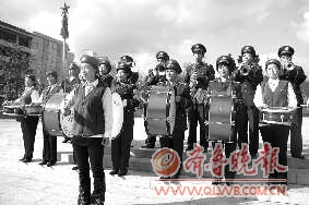 24日上午早8点,突袭的冷空气让威海街头来往的路人裹紧大衣。而在环翠楼公园,一群的特殊乐队正演奏得热火朝天。他们有的白发苍苍,有的青春年少,却都身着军装演出服,满身朝气地用手中的大鼓、号、唢呐、萨克斯,合奏着着一首首激越昂扬的曲子。