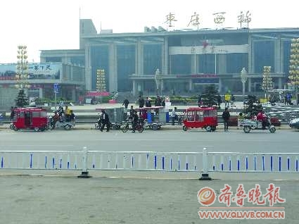 日前,记者在枣庄西站广场旁边的路上看到,很多三轮车停在路边等着出站的乘客,火车站广场到马路的道路已被堵住。