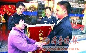 25日下午,唐基兰右手拿着一面锦旗,左手提着两大兜水果,来到观音阁派出所。终于见到了扶她起来的小伙子,唐基兰走上前去紧紧握住徐恩亭的手,哽咽着对他说:“太谢谢你了小伙子……”然后唐基兰老人将锦旗给了观音阁派出所所长张斌,把两大兜水果硬塞到了徐恩亭的手里。