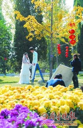 25日,一对对新人来到第六届金秋菊花展蒲园展区,选择这个时候到蒲园拍摄婚纱照片,赏心悦目的菊花加上甜蜜幸福的微笑,给这次菊展带来了不少别样的韵味。 沈波 李运恒 摄影报道
