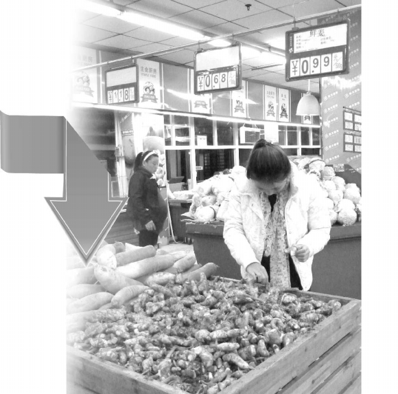 25日,记者在胶州路某超市看到刚上市的鲜姜已经摆上堆头,售价为0.99元每斤,价格相比去年有大幅下降,“去年刚上市时大约4元每斤,今年确实便宜不少。”销售人员称。 本报记者 张大宁 摄