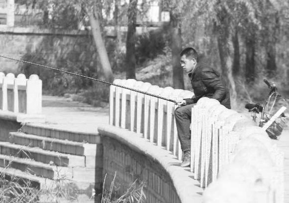 25日,运河边一男子坐在只有十厘米宽左右的护栏上钓鱼,河水较深,如此钓鱼有些危险。