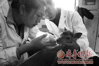 14时25分,初生的小鹿已经没有力气再追着母亲要奶吃,饲养员和兽医见“点点”没有喂养的迹象,只得又对“羊奶妈”取奶,再次人工喂养。15点30分,小鹿第二次进食,吃了15毫升。