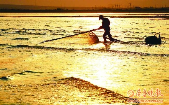 撑起虾网绑好高跷的胡顺利,用塑料袋里三层外三层地包好自己的半盒香烟,塞进帽子戴到头上,扛起虾网拎上虾篓走进海中。等海水漫过腰的时候,见他用虾网支撑平衡,娴熟地踩上了跷。他说,越往深处走,毛虾个头越大数量越多,但是水深了迈步和推起网都会更吃力。十多个推虾人就在离海岸十多米远的海中,推着虾网来来回回,老胡说在这么远的地方是听不到岸边的海浪摩擦海岸的声音的,不难想象那样宁静持续久了,一样的震耳发聩。