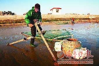 岸边的平地已经停满了各式的交通工具,胡顺利停好拖拉机,家伙事儿没拿就到坐在岸边的人群里扎堆。因为海水还没有完全退去,十多个来推虾的人们都围坐一起。他们大都是四十岁开外的汉子,说踩高跷推虾没什么技术含量,只要有足够的力气,所以女人干不来。而青年人嫌推虾收成不稳定、挣钱少,更多地选择外出打工。胡顺利的两个儿子一个从事海产品养殖,另一个养船海捕,而他自己也只是农闲的时候下海推虾皮。