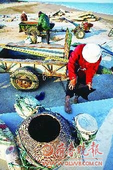 下到海里,人站立推着网往前走,感觉网里有虾皮时就将网扳起,把虾皮合到网窝,再用舀子将虾皮舀到身后拖挂着的虾篓内。虾篓是浸在海水里的,四周拴着三个密封的葫芦,起浮漂作用,保证小虾既不暴露在空气中,又不会沉到海里随海水游走。