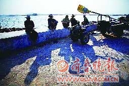 ③几个推虾人在岸边换上防水服,做好下海准备。