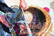 ⑤推虾人用舀子将虾皮舀到身后拖挂着的虾篓内。