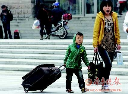 26日,在泰山火车站广场,刚下火车的家长哈欠连连,精神头十足的小男孩,则担当起拉行李的任务。本报记者刘丽摄