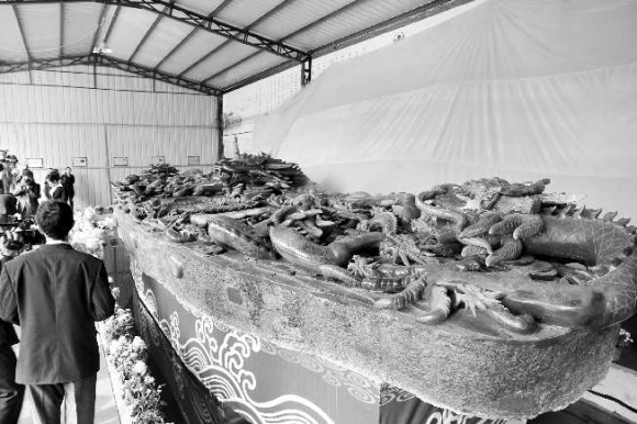 据了解,聚龙奥砚全长13.8米,宽3.8米,高1.6米,重68吨,由27位雕工历时4年之久雕刻完成,砚体雕刻有56条龙、中国版图、奥运五环、北京印以及福娃等,重量和规模堪称世界之最。由于奥运场馆无法展放,聚龙奥砚转为民间展存,最终确定存放临沂。 本报记者 伟伟 摄影