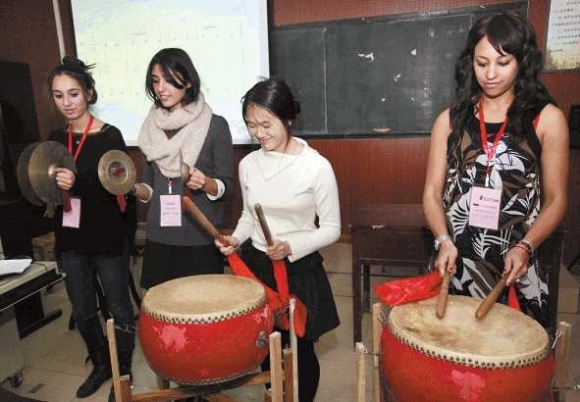 下午,在聊城三中艺术楼,音乐课让法国学生十分兴奋,课堂也很活跃,他们用一节课的时间就学会了民歌《茉莉花》,很多学生抢着参加互动。“我最喜欢那个古筝,它太美了。”女生劳伦看到各种乐器很激动,上台参与了好几次互动,还跟着老师第一次用中国大鼓敲了一段曲子。“第一次唱中国民歌,摸中国乐器,感觉太棒了。”音乐老师夸赞说,法国学生的动手体验精神强,比较活跃。