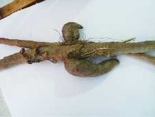 26日中午,在一家复印店内,记者见到了邵女士所说的山药。因为隔得时间有点长,两根山药有些干枯了。在两根山药的中间部位,各有一个芋头大小的“疙瘩”。“疙瘩”周围生了不少细须,将两根山药缠绕在一起。