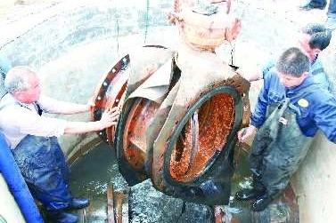 10时20分左右,在检修人员将阀门之间的锈迹清除后管道里的水大量溢出,阀门在吊车的起吊下慢慢活动,然后被成功吊出井内。这个工作了8年的阀门终于“退休”了。记者看到,吊出的阀门内已经锈迹斑斑,两头的橡胶圈也已老化。