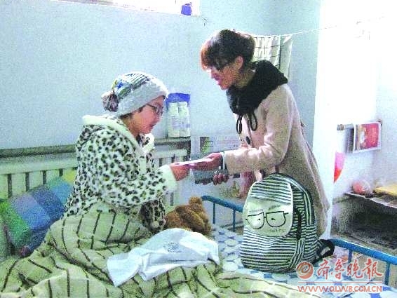 山大威海分校一名癌症女生张艺文发帖求助获得万人捐助(详见本报10月21日C04版)。26日清晨,在济南市山东省肿瘤医院对面一家小旅馆里,刚从山大威海分校赶来的老师和学生,为张艺文一家送来了6.2万余元现金。接过这份厚厚的爱心,艺文的母亲为此感动落泪。图为同学为张艺文递上了学校一研究生为她写的一封鼓励信。 本报见习记者 王茂林 摄
