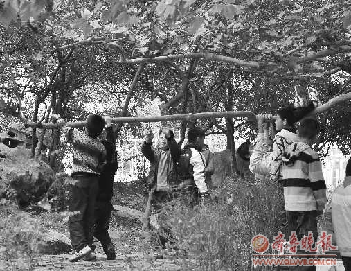 26日下午,在立新小学附近,很多学生爬上树枝摇树枝玩,一位市民说:“这么个玩法树枝可受不了,学校应该加强学生的公德教育。” 本报见习记者 武春澍 摄