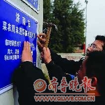 10月28日,济南市城管工作人员在为各处蔬菜直供点挂牌。一些菜农捷足先登赶来卖菜。来自章丘的菜农李秉珠就是“尝鲜”的一位。