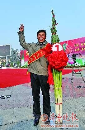 悦。算起来,他已经参加了6次大葱评选,有三次摘得第一名。去年,他种出的“状元葱”高达2.17米,今年,他又带着10棵大葱参赛,它们的平均身高达到了2.14米,单株最长的葱白足有1.17米。这些大葱为宋光宝赢得了一万元的奖金。