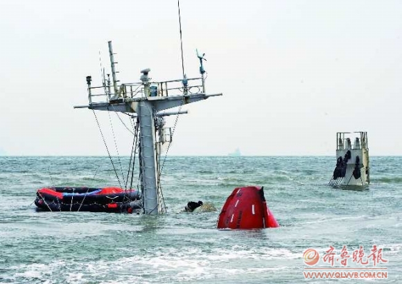 10月28日19时35分许,两艘巴拿马籍货轮在青岛海域碰撞,一艘货轮沉没。经初步核实,船上共有19人,其中8人获救,1人死亡,其他10名船员正在搜救过程中。经初步核实,沉船上19名船员全部为朝鲜籍。图为10月29日,已经沉没的巴拿马籍货轮“ORIENTAL SUNRISE”轮桅杆顶部露出海面。 新华社发