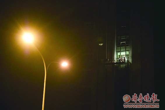 10月31日21点半左右,北京路一建筑工地,两名身穿棉衣的建筑工人正在第8层楼房的外墙上挑灯施工,他们都没戴安全帽,施工安全有隐患。几位路人感叹:“又冷又危险,真不容易!”本报记者 刘涛 摄影报道
