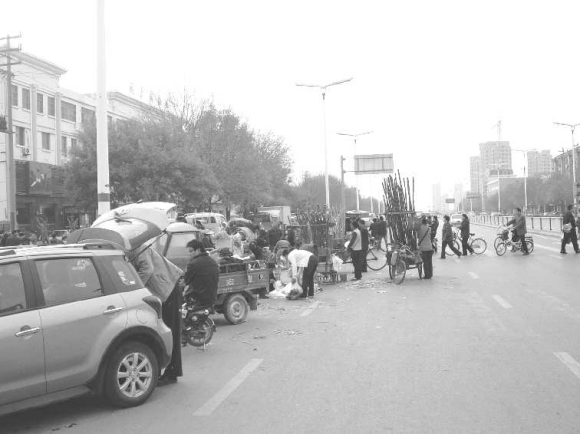 10月31日下午,记者在黄河路与西三路交会处以西路南看到,商贩将摊位摆到了机动车道上,使得原本4条机动车道变成了2条,严重影响了机动车的正常行驶,市民望有关部门予以关注。