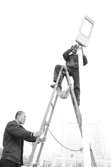 10月31日上午,记者在新世纪广场上看到工作人员正在更换LED灯。据现场泰克拓普的施工人员介绍,本次在广场旗杆边上更换了4盏LED灯,更换后可方便市民晚上在广场活动。 本报记者 任小杰 摄影报道