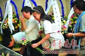 “来送送他吧,他年龄跟我孙子一般大,想不出他母亲该有多难受!”2日下午2时30分,白发苍苍的广州市民孙女士在孙子搀扶下踏上一级又一级台阶,来到广州殡仪馆白云厅前。追悼会定于下午3时举行,2时30分左右,广州市民就不断从各个方向赶来,送英雄最后一程。3时,一群群赶来送别的人已站满可容纳千余人的大厅。告别厅最前端,鲜花簇拥着水晶棺里英雄的遗体,两侧台柱上挂着巨大的挽联:“舍身取义见义勇为万众颂人杰,忠孝仗义身体力行七尺好男儿。”